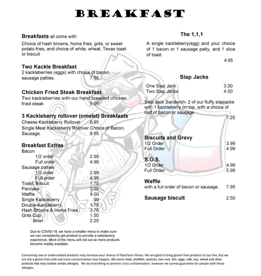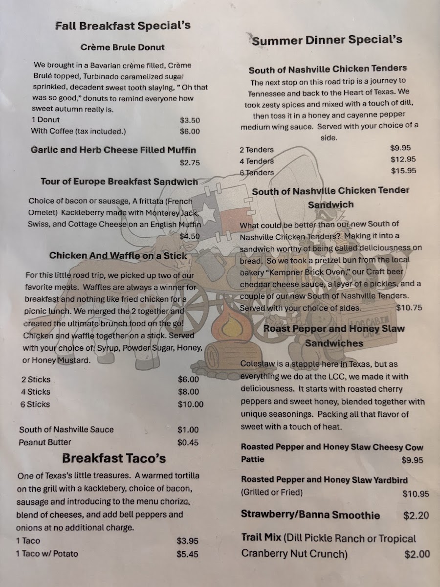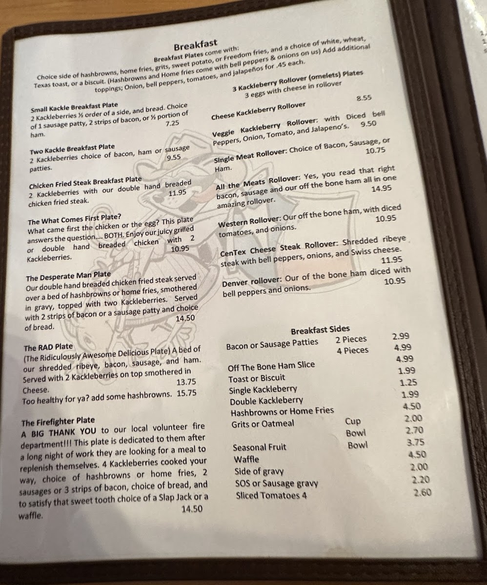 From a reviewer’s perspective, the menu at Log Cabin Cafe feels like a confident celebration of classic comfort food, keeping things simple while clearly knowing its audience. Breakfast is the true heart of the menu, led by hearty plates such as Small Kackle Breakfast Plate, Two Kackle Breakfast Plate, Chicken Fried Steak Breakfast Plate, The What Comes First Plate, and The Desperate Man Plate, all designed to satisfy everything from a light morning appetite to a full-on country-style feast. These main plates are well supported by practical and familiar Breakfast Sides like Bacon Or Sausage Patties, Off The Bone Ham Slice, Toast, Single Kackleberry, and Double Kackleberry, which allow diners to customize their meal exactly to their liking. For those who want to add a little extra indulgence, the Breakfast Extras section-featuring Bacon, Sausage Patties, Toast, Biscuit, Pancake, and Waffle-rounds out the morning offerings with all the staples you’d expect from a traditional American café.