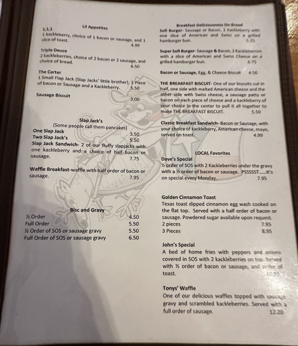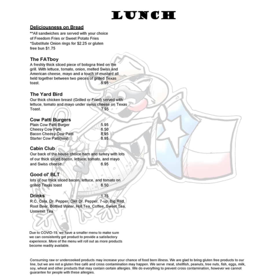 As the day moves into lunch, the menu remains focused and approachable. Sandwich options like The Yard Bird and Cabin Club provide satisfying, no-nonsense choices that feel consistent with the café’s rustic identity. Meanwhile, the “Others” section adds even more character with items such as Triple Deuce, The Carter, Sausage Biscuit, Slap Jack Sandwich, and Biscuits And Gravy, reinforcing the idea that this is a place built on familiar flavors and generous portions rather than trends. Overall, the Log Cabin Cafe menu leaves a strong impression as a dependable, comfort-driven lineup that values hearty breakfasts, classic sandwiches, and straightforward choices-making it easy to understand why it appeals to both locals and travelers looking for a filling, down-to-earth meal.
